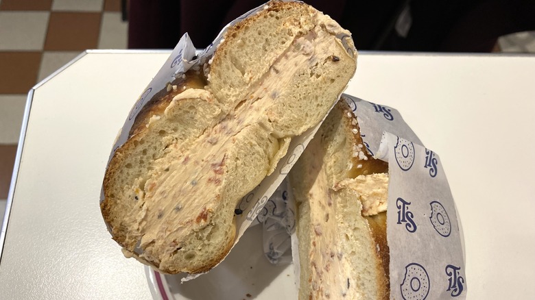 "Sometimes I'll do a jalapeño [schmear]," he says. "I call it spicy salmon." This subtle, heat-packed flavored cream cheese variety can also be an enigma for some when figuring out how best to pair it. But, just like cheesy jalapeño poppers, once you land on a winning combination of spicy-meets-creamy, it can be hard to stop. Add lox, tomato (if in season), red onion, and capers, and you've got a sandwich that hits a little bit of everything: salty, creamy, chewy, savory, and spicy. Martensen laughs as he discusses changing up his standard everything bagel order.