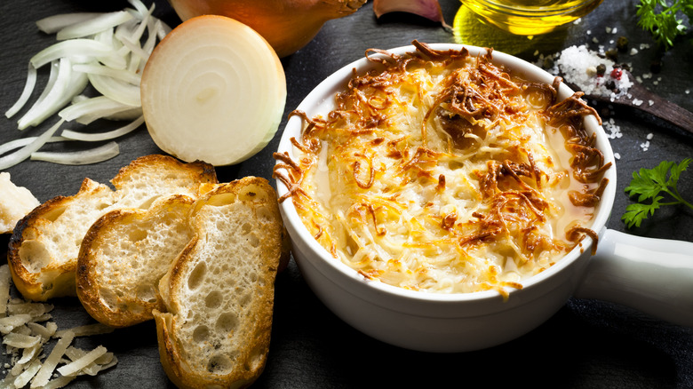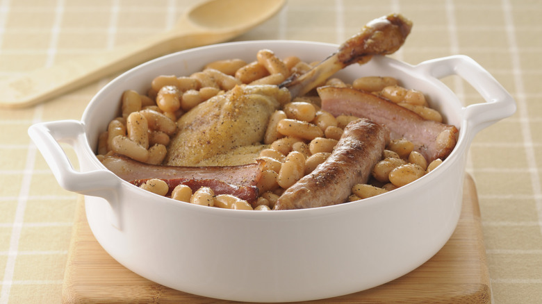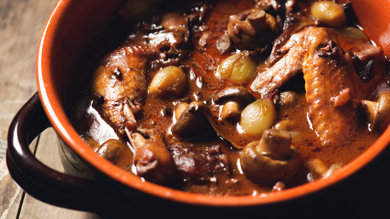 Poultry takes pride of place in French cooking with such joys as delicious coq au vin or duck confit. But if you've never heard of these, don't fret — that's what we're here for. The first literally means "rooster in wine," though you're welcome to use a chicken of any gender if you're making this dish at home. That said, we recommend you order this at a restaurant if you see it on the menu since, while you can make coq au vin on your own in a crockpot, it is a long and laborious recipe.