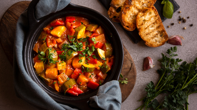 Unless you've been living under a rock, you've probably heard of the popular Pixar animated feature "Ratatouille," in which an enterprising young rat showcases his talents as a chef by improving the fortunes of one of the most prestigious (made-up) restaurants in Paris. Anyone who's seen the film knows that ratatouille is also the name of a traditional French vegetable dish made with eggplant, zucchini, tomato, bell peppers, and various spices and herbs. It is typically served as a side and is a very flavorful way to get a bunch of veggies and nutrients in one single, glorious bite.