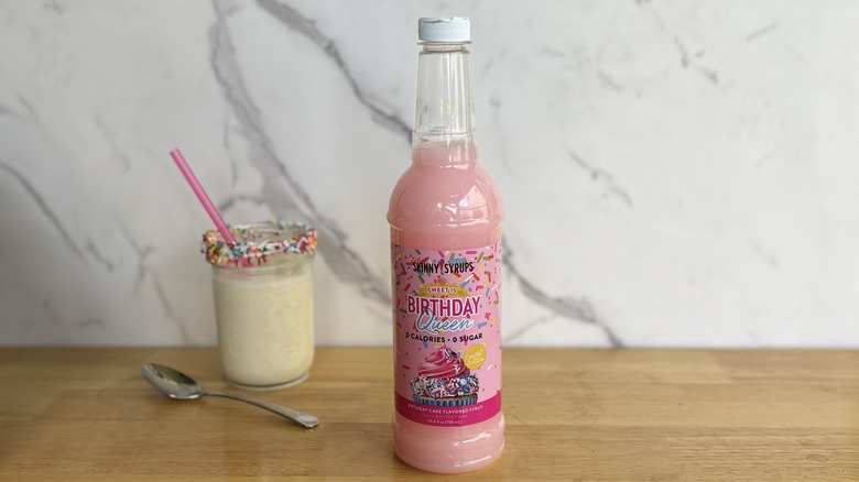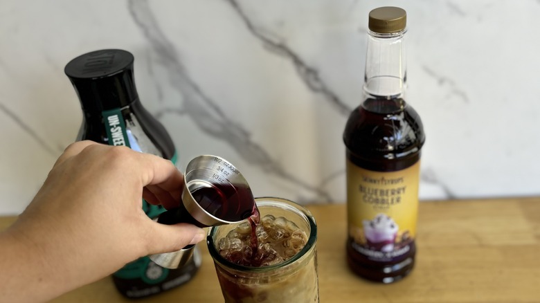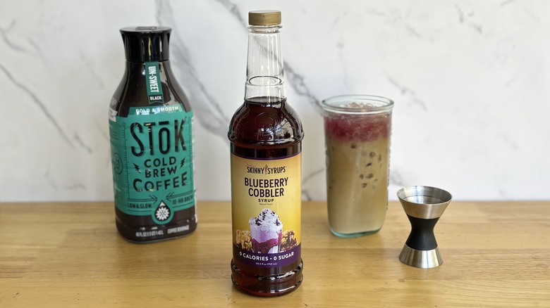 One of the more viral Dunkin' secret menu drinks involves making something of a blueberry cobbler drink. Jordan's Skinny Mixes' blueberry cobbler syrup seems to attempt something similar with the bottle's instructions for a cold brew. It combines 2 tablespoons of the syrup with 8 ounces of cold brew over ice, before adding in the milk of your choice.