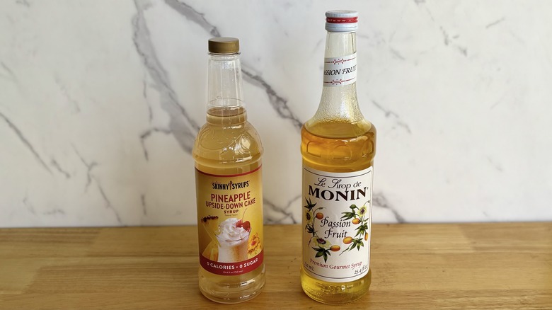 Although I didn't have direct flavor comparisons between Monin and Jordan's Skinny Mixes, I decided to compare them based on similar flavors. After trying Jordan's pineapple upside-down cake, which offered fruity flavors, I compared it to Monin's passionfruit syrup, a memorable fruity option from its line. I sampled a bit from the lid of each syrup to gauge their flavors and differences.