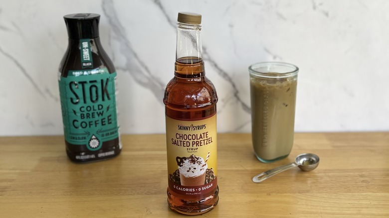 I made a cold brew for this Jordan's Skinny Mixes syrup, too. Going into this tasting, I've always found that chocolate syrup that's in this thin syrup formula rather than a sauce — like the mocha from Starbucks, for example — to be really hard to achieve that real chocolatey flavor. As a result, this chocolate salted pretzel syrup was already fighting an uphill battle.