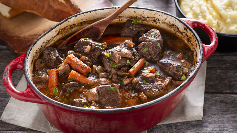 For meat eaters, there can be little as satisfying as letting a pot of beef stew simmer away for a cozy dinner. Adding a bunch of ingredients into a pot or slow cooker and leaving it to form a delicious, hearty meal can be really rewarding. What's even better is when the stew is packed with a rich, deep umami flavor. There are various ways that people achieve this — whether by adding some soy sauce or mushrooms, or by searing the beef first, everyone has their preferred technique. One more to add to your repertoire? Anchovies are the unexpected ingredient for a better beef stew.