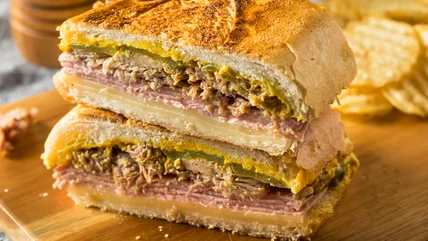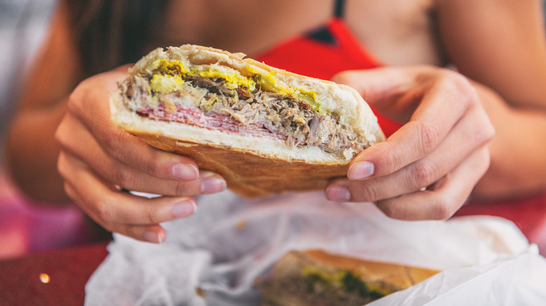 Rich, colorful, and packed with mouthwatering flavor, Cuban sandwiches are true works of art. While the ingredients can vary a bit by recipe, you'll need these basics to make your sandwich a Cuban one: roast pork, ham, pickles, mustard, and Swiss cheese. Most of the focus is on the first four ingredients — after all, marinating the pork in an array of tasty juices and spices can take up to eight hours, and pickles are what make the meal pop. It's also a good idea to use the right type of bread for a perfect Cuban sandwich since a loaf of Pan Cubano is traditional.