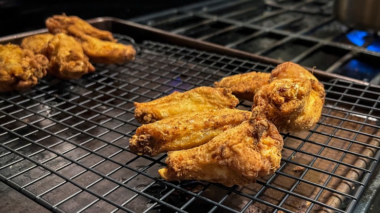 There is a good reason fried chicken has mostly stayed in the world of takeout and grocery store hot bars: It's a real challenge to make a good, crispy version at home. Deep frying can already be intimidating, and despite the seemingly simple concept, and there are a lot of small mistakes you can make with fried chicken that can leave you with a bland, greasy, or soggy disappointment for a meal. You can't fry too hot or too low, your breading or batter needs to be well seasoned and the perfect consistency, and even with all those precautions, if you handle your fried chicken poorly after it's done, it can still be ruined. This is especially challenging when you are preparing it for a party or cookout, when you need to be making batches at a time and letting the chicken rest for an extended period. It's an invitation for sog. Thankfully there is one easy way to keep your chicken fresh, hot, and crispy — all you need is an oven-safe rack.