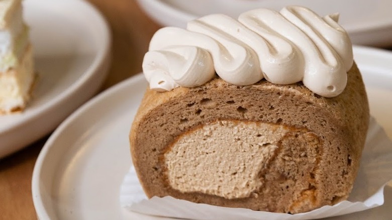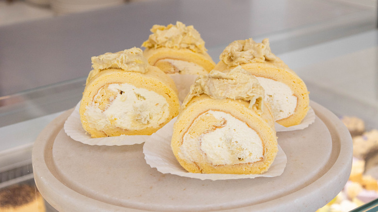Durian flesh looks a bit like mango, but the texture is of cotton candy tendrils that cling stubbornly to your teeth and tongue, effortlessly fending off any attempts to wrench the offender from your mouth. Despite sounding something straight out of a horror movie, durian remains a delicacy and an essential part of the Southeast Asian flavor experience. "The taste of durian is very creamy and sweet — almost custard-like," Lau explains. "But there's also a lot of different types of durian, some orange, some really small, and some that have a slight bitterness to them." Baking into a cake or tart is the perfect medium to meet durian because the texture can be tempered, and the smell is subdued in the baking process for a gentle introduction. Use it as a filling (or topping) when you're ready to crank the intensity, like in the durian Swiss rolls above.