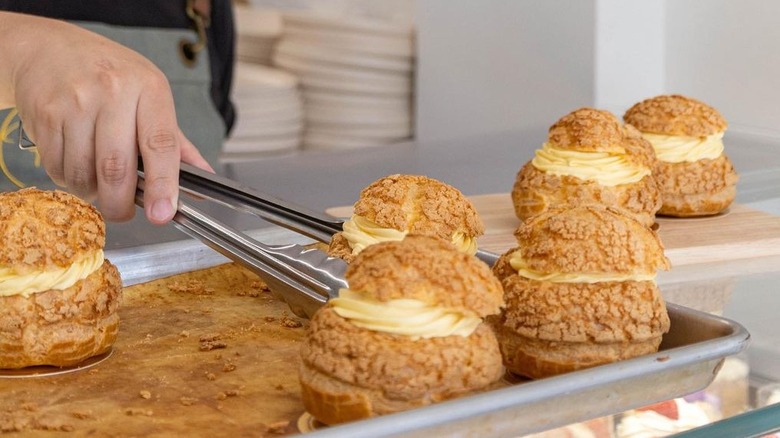 In baking, you'll find it in the traditional Thai dessert khek ma-muang, a cake with a coconut base and cream icing piled high with mango, but it's just as well-placed in cheesecake form combined with caramel or reimagined in vanilla mango daifuku choux (pictured). The latter strikes a sublime textural balance, the soft mango mascarpone curd and chewy mochi a counterpoint to its crunchy vanilla craquelin surround. Opt for the freshest mangoes you can find for maximum return on investment.