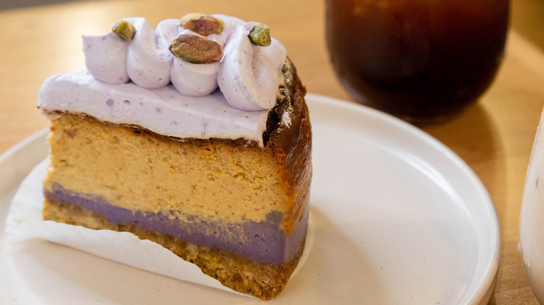 Taro and ube tend to be used interchangeably or together in Southeast Asian cooking. Both have subtler flavor profiles, so larger amounts are required for the full presence to be felt in the baking. The pair work well in cheesecake (pictured) and also make for gorgeous beverages. "... I like to make it as a paste mixed with coconut (helps enhance the flavor) as it makes it easier to incorporate it as a filling as well as in lattes," says Lau.