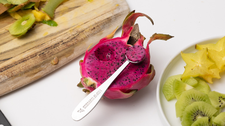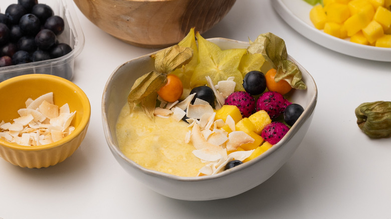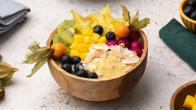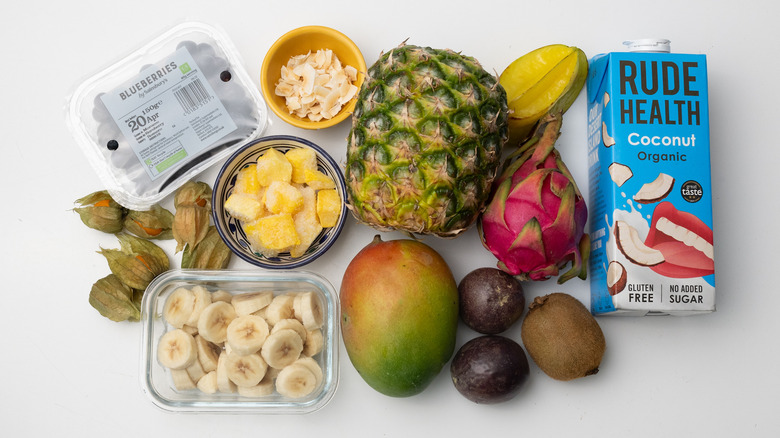 For the toppings, the world really is your oyster. The main thing to aim for is adding a mixture of colors, tastes, and textures to your smoothie bowl to keep things interesting both visually and flavor-wise. To keep things simple, slices of orange and banana make great alternative tropical toppings, as does melon. If you are struggling to get your hands on a star fruit or dragon fruit, options like guava, soursop, or lychee can work in its place. This tropical smoothie recipe offers a great way to try new and unusual fruits, so don't be afraid to experiment. And, it's always worth asking your local green grocer what they have in store that they can recommend; you never know, you mind end up discovering your new favorite fruit.
