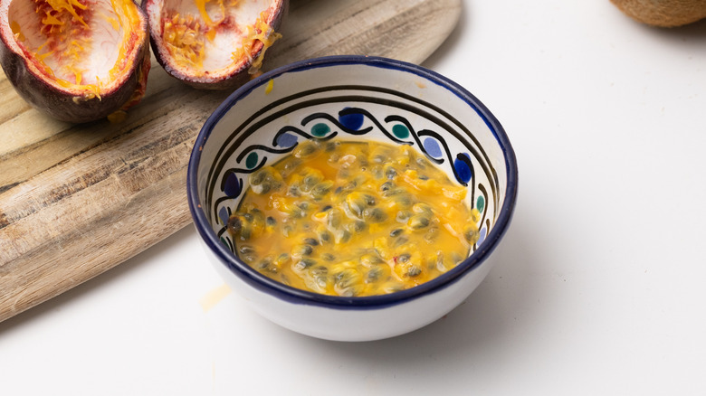 - Prepare the passion fruits by halving each one and scooping out the pulp.