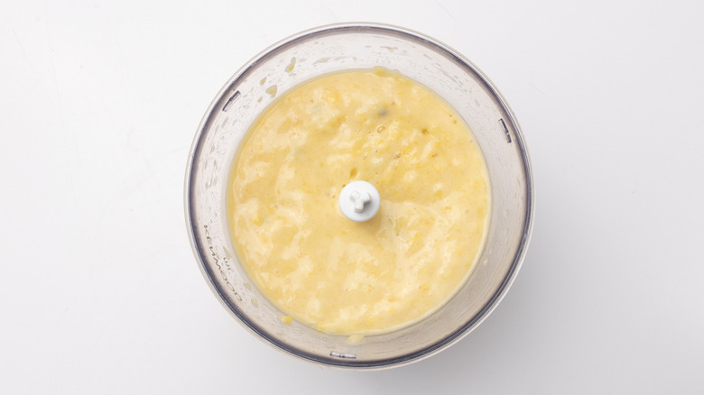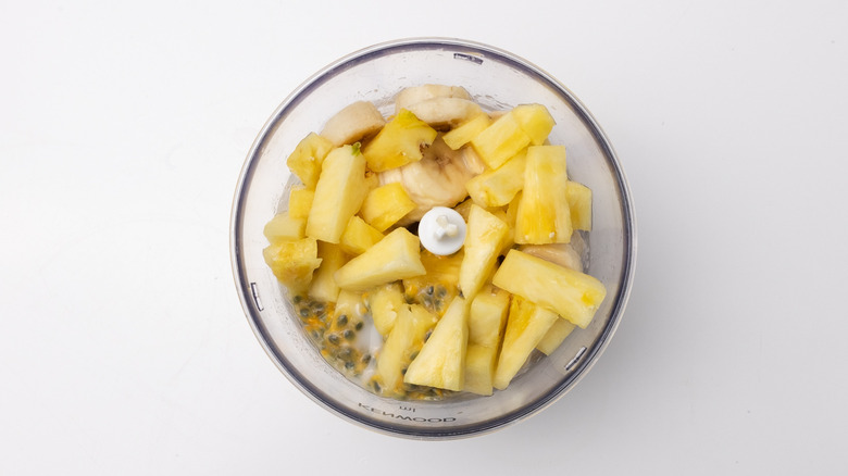 - Add the pineapple, frozen banana, frozen mango, passion fruit pulp, and coconut milk to a food processor.