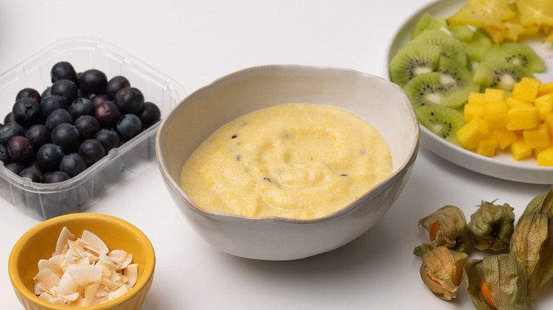 Created by Tasting Table recipe developer Jennine Rye, this tropical smoothie bowl is a great addition to your mornings, afternoons, evenings — basically, you can't go wrong with this treat. A smoothie bowl is simply a thicker version of a smoothie that is served in a bowl, accompanied by a variety of other fruits. This tropical smoothie bowl has a lovely creamy texture and a super zingy tropical flavor that is guaranteed to add a bit of sunshine to the start of every day. With a blend of pineapple, passion fruit, banana, and mango, this smoothie bowl is bursting with vitamins and minerals, which are further supplemented by the additional topping of tropical fruits and coconut flakes. Super quick to assemble and easy to customize, this tropical smoothie bowl makes a refreshing breakfast option that is perfect all year round.