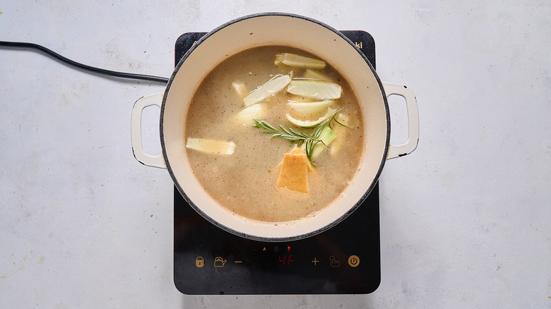 Add the rosemary, thyme, salt, pepper, fennel, Parmesan rind, and chicken stock to the pot. Reduce the heat to low, cover, and simmer until reduced to about 1 cup of liquid, about 40 minutes.