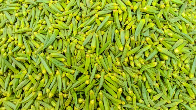 Before even getting to the cooking process, you'll need to know how to pick the freshest okra at the store. Piles of okra might be intimidating to you, especially if you don't have experience with this vegetable. It's also important to pick the right okra pods if you want to eat them raw, as older pods can be tough or dried out, making them hard to chew unless they're cooked for a long time. To start, always look for the okra with the brightest green color and avoid the dull, browner-looking pods, or any okra with brown spots.