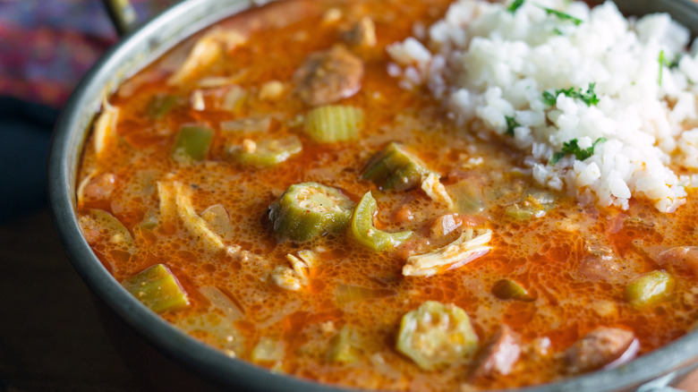 If that's a wellness-boosting bridge too far for you, start with cooking okra in ways where you use the slime to your advantage instead. Sure, okra can be added to soups to thicken them up, and we've seen that it's an essential addition to gumbo, but you don't have to stop there. Add okra to any liquid-based dish like stew, curry, or even risotto. The pods will add flavor and thicken the consistency of whatever you're cooking, adding more depth. Plus, then you don't have to worry about all these time-consuming techniques to help reduce the sliminess. Simply chop the pods up and throw them into your pot.