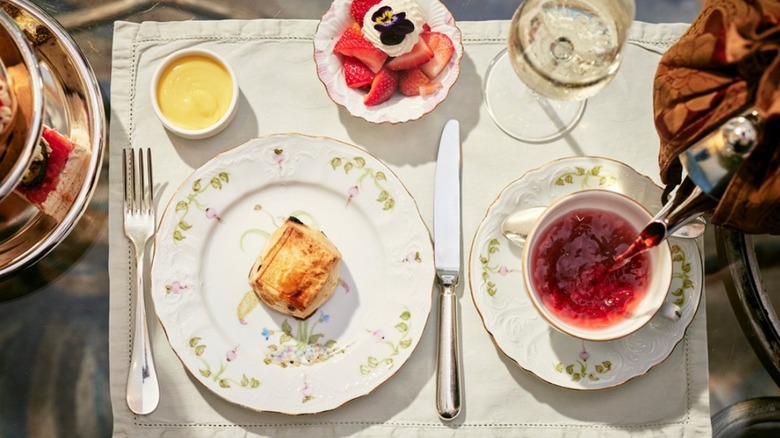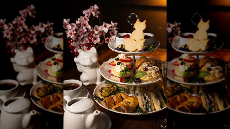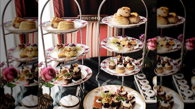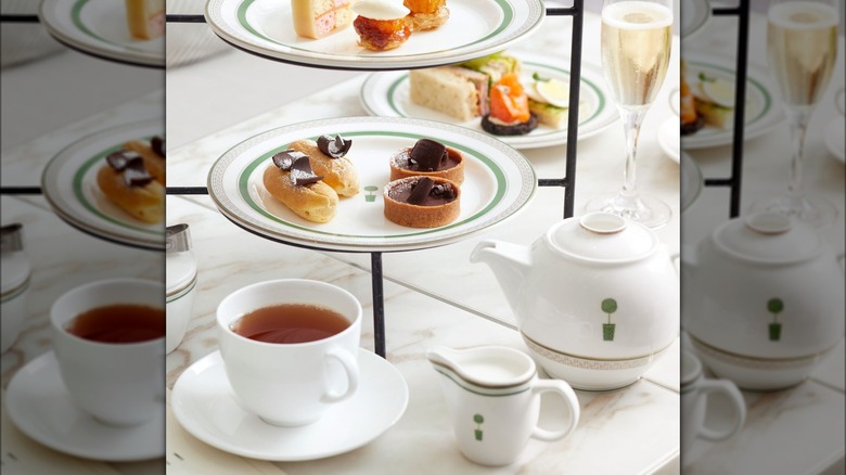 Guests start by choosing from Earl Grey, chamomile, peppermint, oolong, or rooibos tea. Guests are then treated to a three-tiered tray of treats, with savory items on the bottom. In addition to heartier British favorites like spinach quiche and sausage roll, guests can tuck into a roast beef sandwich with arugula and horseradish cream or a curried chicken and apple sandwich. The middle tier contains raisin scones served with clotted cream and a rich cinnamon orange marmalade, before concluding with light bites like cookies, cakes, and seasonal berries on the top tier. If you want to enhance your spread with a cocktail, consider ordering the refreshing West Drayton made with an Earl Grey-infused gin.