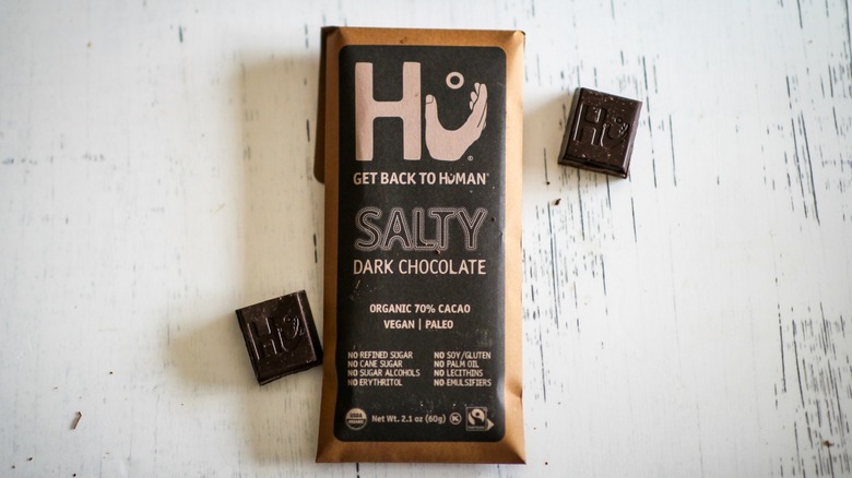 I sampled the Salty Dark Chocolate bar — and I'm glad I did. Although this bar had 70% cacao, it didn't have the same bitter undertones as the Ghirardelli Intense dark chocolate bar. Instead, the Hu bar was mild and rolled off the tongue with strong hickory notes and earthy undertones. The best thing about this bar, though, was the salty coating visible to the naked eye. Every bite was balanced with salt, which is much more than any other brand on this list could ever dream about.