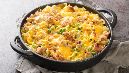 You could take a cue from poke bowls and make your salmon noodle casserole with lemon pepper, Gochujang paste for sweet-spicy flair, scallions, black and white sesame seeds, and a drizzle of Kewpie mayonnaise to serve. Or whip up a Tex-Mex-inspired salmon casserole with rotini pasta, frozen corn, canned fire-roasted tomatoes, diced green bell pepper, black olives, breadcrumbs, and shredded cheddar and pepper jack cheese. To let the bold salmon flavor shine, surround it with a mild yet complementary lineup of egg noodles, asparagus, thinly sliced leeks, white cheddar cheese, and minced fresh parsley.