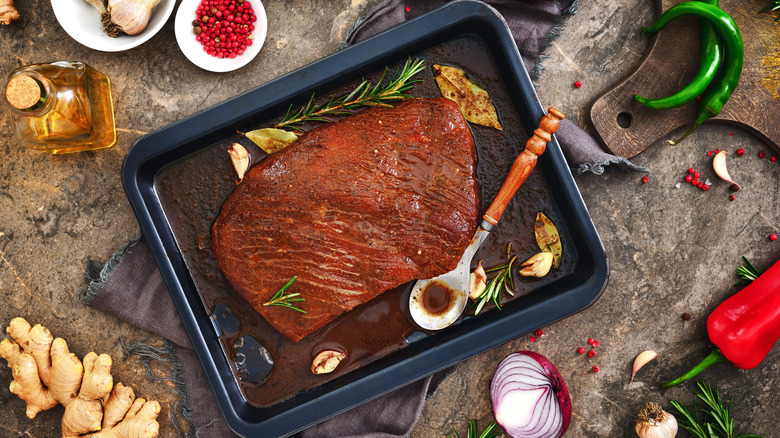 Flavorful as it is, skirt steak can do with a bit of seasoning, and there's no better agent for the job than a marinade. This flavor bath even serves a dual purpose: to infuse your meat with aromas and to ensure your skirt steak doesn't turn out chewy. Yet, too much of a good thing can be bad. When you leave your skirt steak swimming in juices for too long, you run the risk of ruining its flavor and texture.