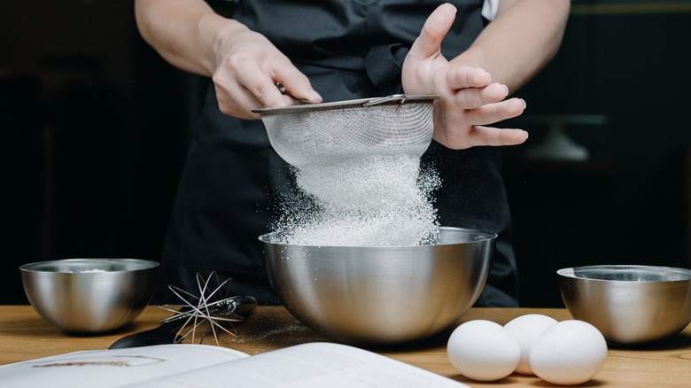 Sifting flour is not just a routine step for the sake of formality, although it can certainly feel like it. This crucial step helps remove impurities from flour, smoothes out any lumps, and aerates it. In the case of angel food cake, its extremely light batter can benefit from impurity-free flour that doesn't weigh it down. And since whipped egg whites underpin the structure of angel food cake, large clumps may overwhelm the batter and potentially distort the cake's final form.