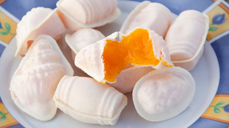 If you're well-acquainted with not-too-sweet Asian desserts, the concept of combining pastries with beans won't sound strange to you. However, it might be a bit peculiar for the uninitiated. If you find yourself in the latter group, try to keep an open mind before trying pastel de feijão (bean pastry). These small, round pastries might be mistaken for their more famous counterpart, the pastel de nata. However, their flavors couldn't be more different. Pastel de feijão features a delicate pastry shell filled with a jam made with white beans, sugar, egg yolks, and almonds. As with many of Portugal's pastries, a bitter espresso best complements the extreme sweetness.