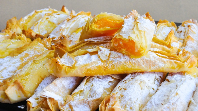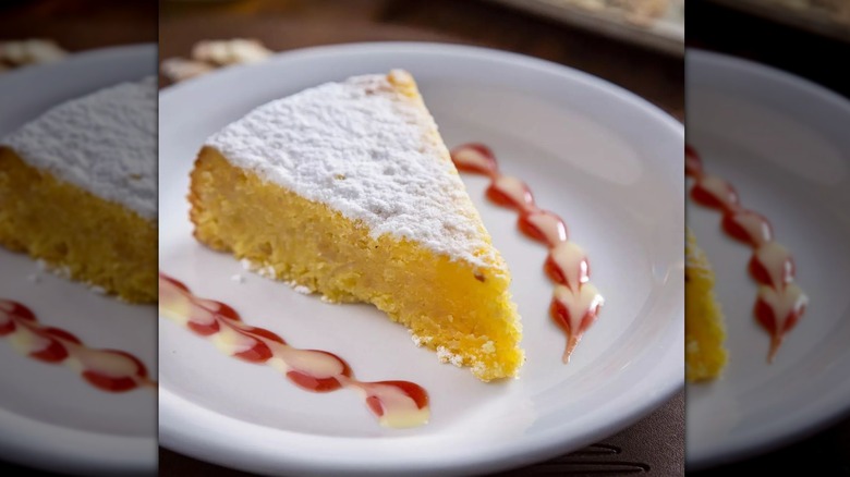 Unfortunately for all of the pork lovers out there, these confections don't actually contain any bacon. Rather, the name references a key ingredient: lard. In this convent sweet, lard replaces butter — which showcases Portuguese pastry-making's inventive spirit. Like other desserts in the Portuguese pastry canon, toucinhos do céu were born from the resourcefulness of convent nuns who made treats using the ingredients they had on hand. In addition to lard, toucinho do céu contain sugar, almond flour, orange zest, and lots and lots of egg yolks. The result is a dense, golden torte that's sliced into triangles and dusted with powdered sugar before serving. Try them at Alcôa, a Lisbon pastry shop specializing in convent sweets.