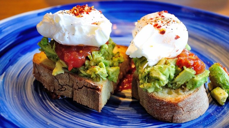 Salsas can be red, green, creamy, or fruity, with textures that range from smooth and liquidy to thick and chunky. Even infused, crunchy chili oil is known as salsa macha. With a plethora of store-bought salsa brands, adding salsa to an egg recipe doesn't take much effort. Plus, jarred salsas will last up to a month in the fridge, supplying flavor to multiple egg-centric meals. You can use the consistency of different salsas to your advantage when incorporating them into an egg dish. For example, a chunkier tomato-based salsa roja would make a great foundation for fried eggs. A cream or avocado-based salsa is a decadent yet refreshing accompaniment to spoon over poached eggs. A dry corn and bean salsa would add heft and flavor to scramble or omelet.