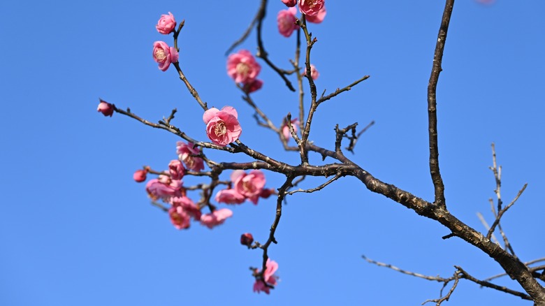 Ume has been highly revered in Japanese culinary culture and history since it made its first appearance in Japan at least as early as 300 BCE (thanks to the discovery of ume pits that have been dated accordingly) but it's actually endemic to China. The collective infatuation was initially centered on ume's purported medicinal benefits. It's been used against fever, nausea, diarrhea, colds, and more — and then broadened to include the bourgeoise-approved aesthetic of ume blossoms. They are just as pretty as the iconic cherry blossom, blooming in reds, whites, and pinks earlier in the year.