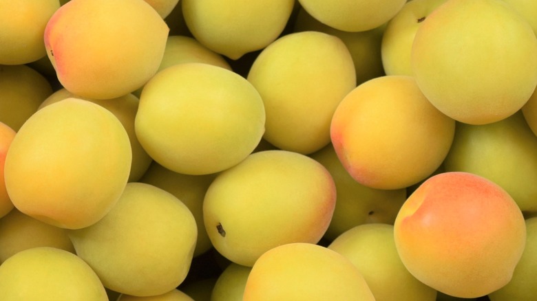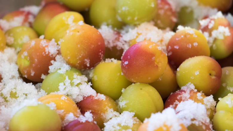 When ume, a small fuzzy spherical fruit, meets heat and salt, you get the salt-kissed flavor bomb Japanese delicacy that is umeboshi. But the salt-kissed flavor bomb is almost constantly typecast as plum and has been from day dot, and the deception runs linguistic-level deep — ume translates to the word plum. In the ultimate culinary mic drop, Rodney Fisher tells us that "Ume is actually a type of apricot." Regardless of the misnomer, ume continues to be referred to as plums, ume vinegar as plum vinegar, and umeshu as plum liqueur, so it's safe to say the nickname has stuck. Ume has yet another name, too: mume. (However, this term experienced its heydey back in the Heian period and mostly isn't used anymore.)
