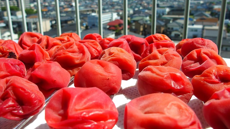 Umeboshi is a staple Japanese condiment that's rather enigmatic outside of Japan. It's a pickled plum, except that it isn't. It's a salty-sour sphere that holds disease-fighting and energy-enhancing properties and is a good luck charm in fruit form. It's also essential if you're planning to eat your way through Japan (here are 30 Japanese dishes you need to try while you're at it). Tasting Table caught up with Rodney and Masako Fisher of Yumesato Farm in New Zealand, experts in growing ume, to do a deep dive into all things umeboshi and how it can be used in cooking and beyond. The pair have been growing ume since 2006 and have since become makers of both umeboshi and other umeboshi-based products like miso dressing, paste, vinegar, syrup, and jam.