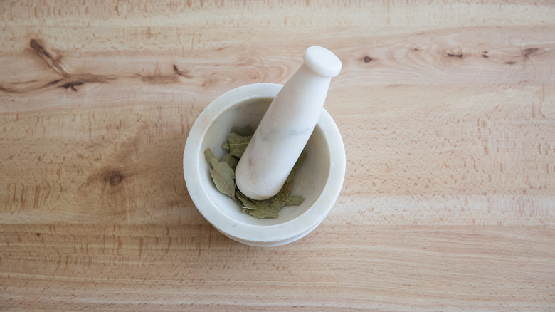 When cooking recipes like soups, the bay leaves are left whole and fished out of the pot before serving. In this case, you'll need bay leaves that have been ground into a powder, since they'll be left in. You can do this by hand in a mortar and pestle. It only takes a few minutes but does require a little patience and elbow grease. If you want to get the job done faster, you can use a spice grinder or coffee grinder and pulse the leaves a few times until they turn into a powder.