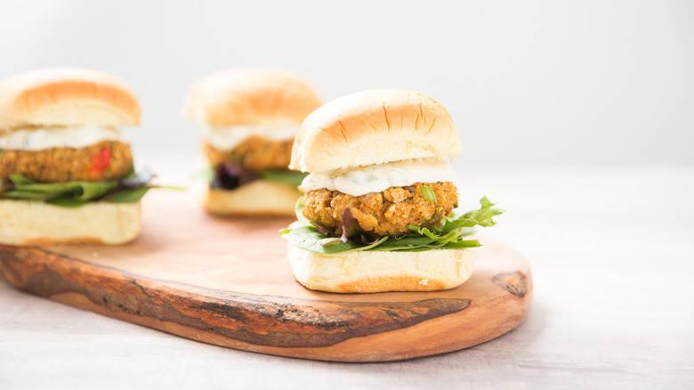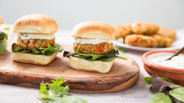 - Serve the crab cakes warm on slider buns with lettuce on the bottom and tartar sauce on top.