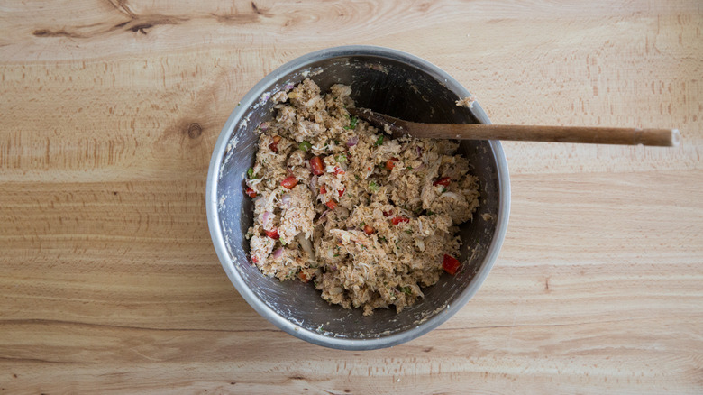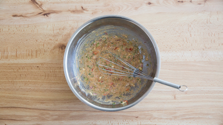 To make the crabcakes, add 3 tablespoons of mayonnaise, 2 teaspoons of Dijon mustard, the egg, bell pepper, celery, shallot, garlic, pepper, and parsley to the bay blend and whisk well to combine.