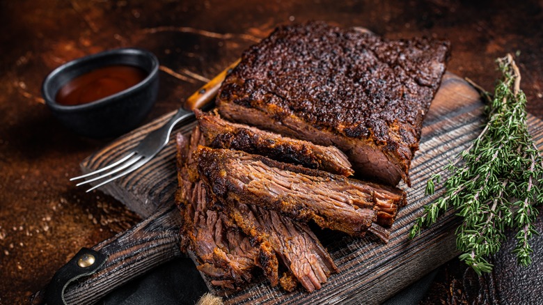 When it comes to slow-cooked meats, it's hard to beat brisket. This sizeable beef cut — which comes from a lower chest beneath the ribs — is full of muscular connective tissue. However, let it patiently tenderize, and you get a juicy, flavorful, and well-textured beef cut. Plus, there are many ways to add flavors to brisket, from the salt and spices that can go into a crockpot of corned beef to a dry-rubbed smoked brisket.