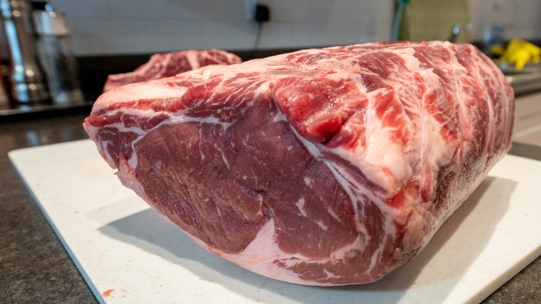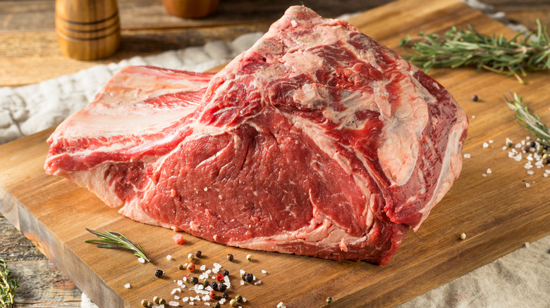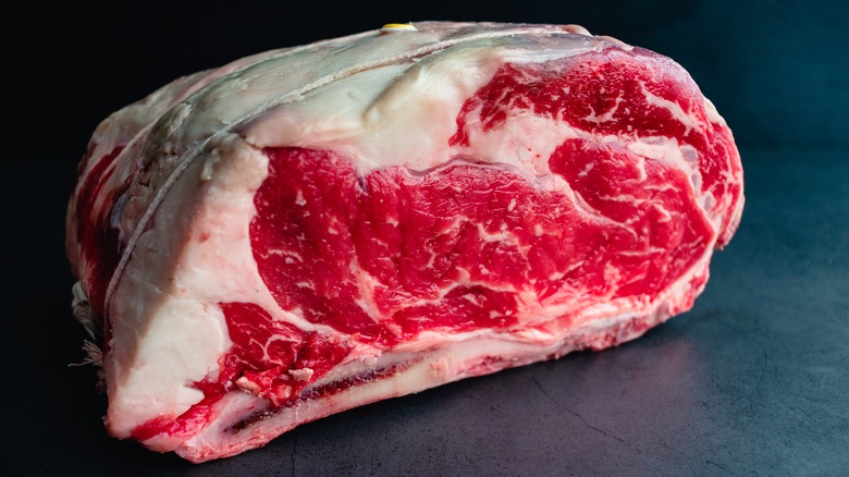 Chef Jean-Pierre recommends looking for prime rib featuring three bones, which should serve roughly six people. Occasionally, you'll see prime rib offered as a rolled roast or boneless. But when it comes to roasting prime rib and getting the most out of it, you want the bone-in option. Besides, it's not called standing rib roast for nothing — you can actually stand the roast up on the bones while it cooks.