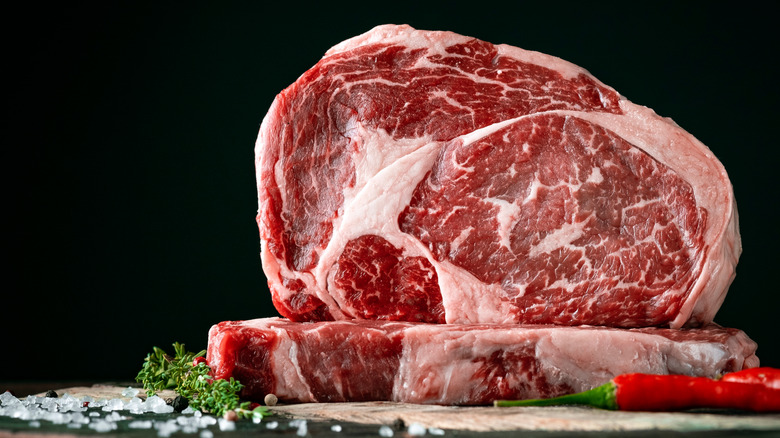 The entire rib section of the cow is considered prime rib roast but can constitute nearly 25 pounds of meat. Because not many folks want to buy a 25-pound rib roast, it's often cut in two. Which is why not all prime rib is created equal — it can depend on the end it's cut from. A cow's ribs are numbered 6 through 12. Ribs numbered 6 through 9 are near the chuck end, feature more marbling, and are, therefore, fattier. Ribs 10 through 12 are closer to the loin end and are leaner. Those who want a fattier, tender, more flavorful roast should opt for the chuck end when buying prime rib.