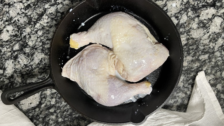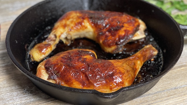 Barrett notes, however, that using different pieces of chicken may affect the amount of time the meat takes to cook. While her recipe calls for 40 minutes in the oven for chicken quarters, drumsticks may take just 35 minutes while breasts (particularly if you choose boneless ones) could be cooked in 30 minutes. As oven temperatures vary, even if you do stick with quarters, your best bet is to use a meat thermometer and remove the chicken once it reaches an internal temperature of 165 F.