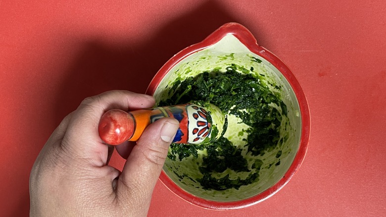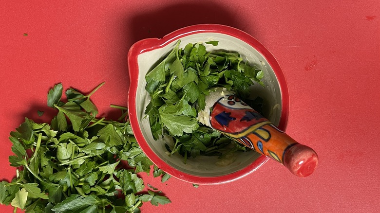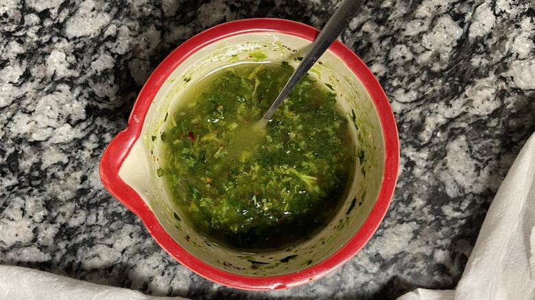 In Barrett's opinion, using a mortar and pestle makes the sauce smell nice and allows the flavors to blend better. She also explains that it's "very satisfying to pulverize ingredients at the end of a long work day" and considers the activity to be "free stress relief." No matter how you choose to make your chimichurri, though, she notes that you'll be able to prepare it a day ahead and then keep it in the refrigerator until you're ready to use it.