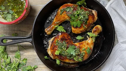 A buttermilk brine helps bring whole chicken quarters to perfect tenderness, and a few pantry staples combine to make an herby chimichurri topping.