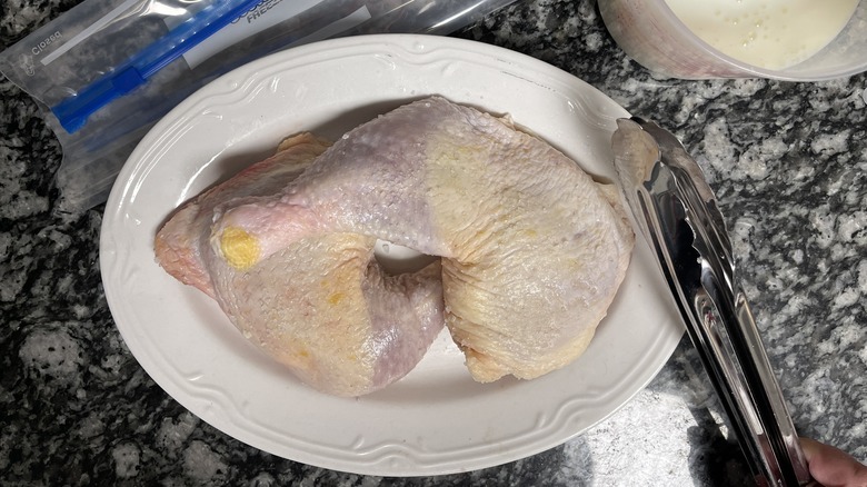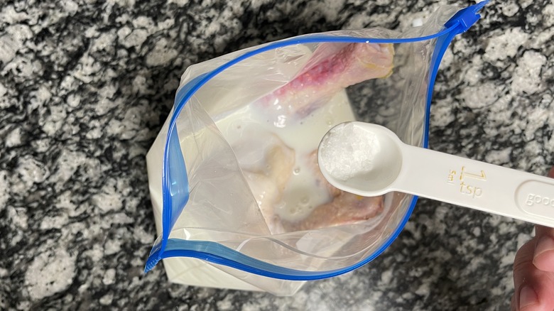 - To a freezer bag, add the chicken legs, buttermilk, and 1 teaspoon salt. Make sure the chicken is fully submerged in the buttermilk, then refrigerate for at least 8 hours or overnight for best results.