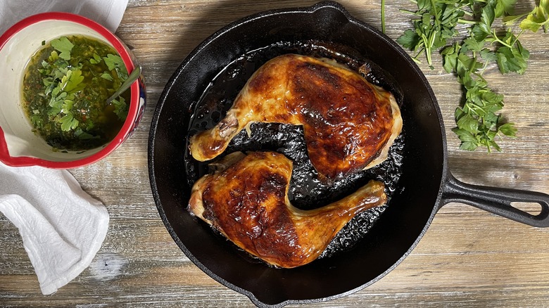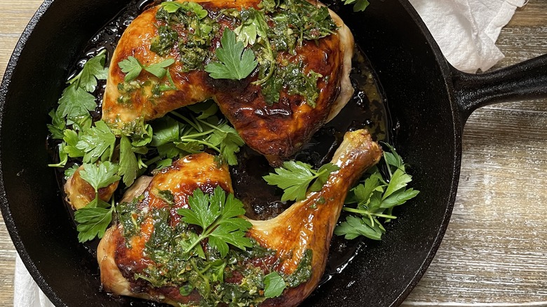As for the sauce, Barrett tells us, "The chimichurri provides a wonderfully salty and tart contrast" to the relatively simple chicken. Surprisingly enough, though, you only need a few ingredients — eight in all — to make both elements of the recipe. While the chicken and chimichurri combo tastes great on the first day, it might be even better as leftovers that are eaten straight out of the fridge (no need to reheat). If you have any extra chimichurri, it can make for a versatile salad dressing, while you could also use it as a sauce for other types of meat or vegetables or even as a dip for tortilla chips or pita triangles.