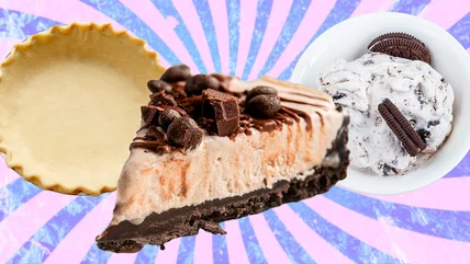 With the countless ice cream flavors, ice cream desserts, and pie recipes out there, you have plenty of fodder for decadent ice cream pie creations. If you're a cookies and cream fan, fill an Oreo crust with cookies and cream ice cream, a layer of hot fudge or ganache, and top with whipped cream and whole Oreo cookies. Use a graham cracker crust for sweet cream ice cream with swirls of strawberry jam and fresh strawberries. For mint lovers, mint chocolate chip ice cream in a smashed thin-mint crust topped with junior mints and crushed candy cane would be heaven.