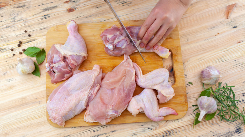 Want to master the art of cooking chicken thighs so they're always crispy on the outside and juicy in the middle? Then you may benefit from updating the way you're prepping your protein. According to a YouTube video featuring Jacques Pépin, the trick to making evenly cooked chicken thighs is to cut two long incisions along the underside of the chicken to expose the bone. This clever method opens out the meat so the thighs cook at a uniform rate and the skin develops into a crispy, golden shell.