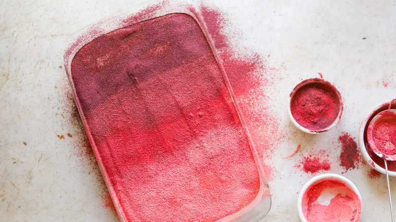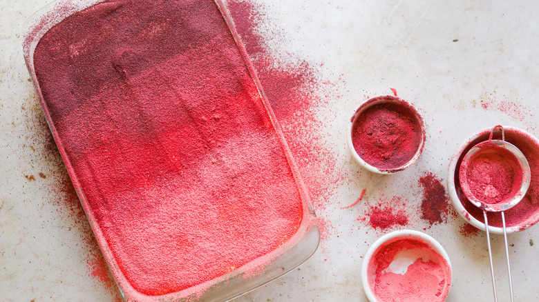 - Transfer the powder to a sieve and dust over the baking dish. Alternatively, separate the three kinds of freeze-dried berries and grind them individually, then dust over the pudding one by one to form a gradient.