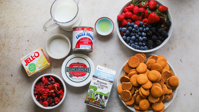 Next, the classic vanilla wafer cookies, such as Nilla. The creamy pudding base is made from a mix of whipped heavy cream, cold milk, sweetened condensed milk, mascarpone cheese for richness, and a packet of French vanilla pudding mix. Finally, the dessert is topped with freeze-dried fruit, blended to a powder in a blender.