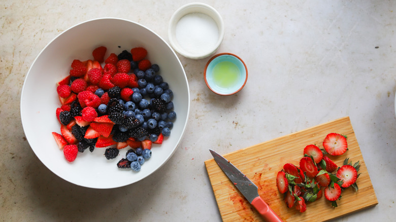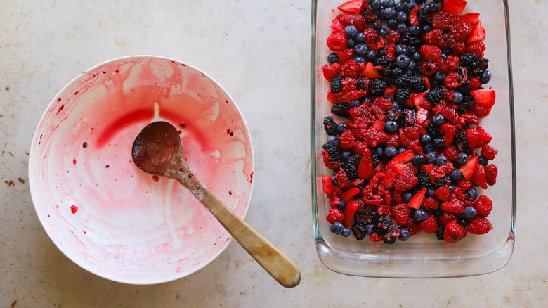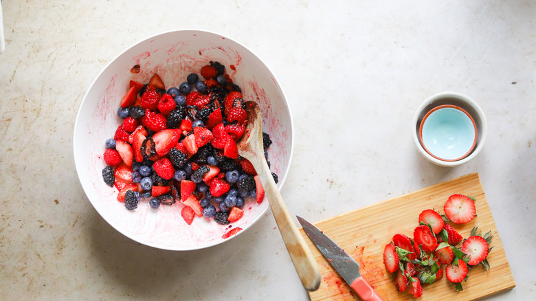 Since we aren't using bananas, we'll need to start with an assortment of ripe berries. If you want, you can use entirely one type of berry, such as strawberries, or use any mix that you prefer. For this recipe, we used strawberries, raspberries, blackberries, and blueberries. The berries are macerated in a mix of lemon juice and sugar to get them nice and juicy.
