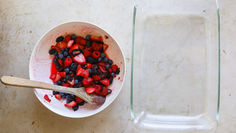 - To assemble, add the fruit to a 9x13-inch baking dish.
