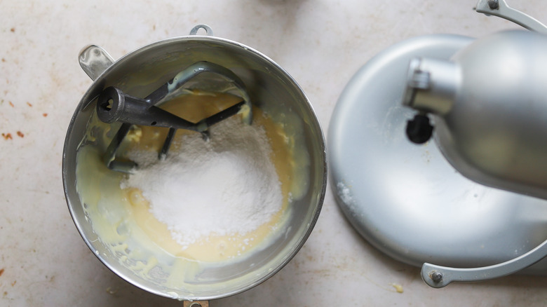 Slowly add the milk, stopping often to scrape the sides of the bowl.