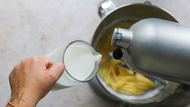 - Slowly add the milk, stopping often to scrape the sides of the bowl.