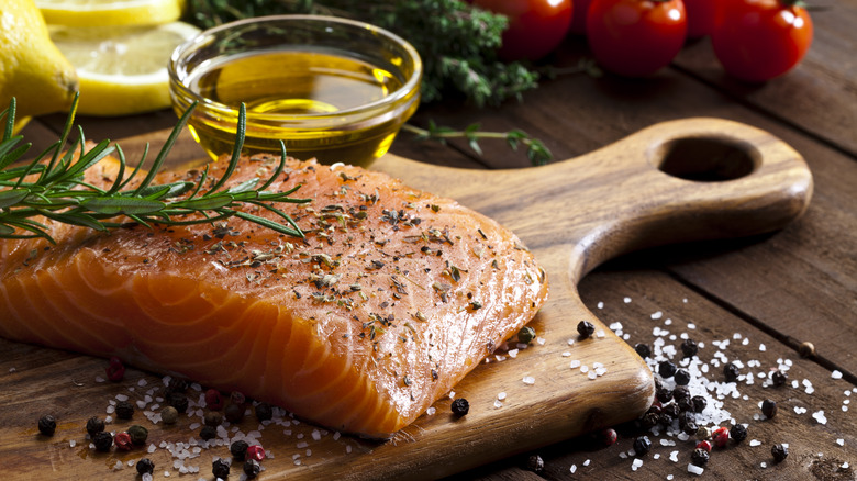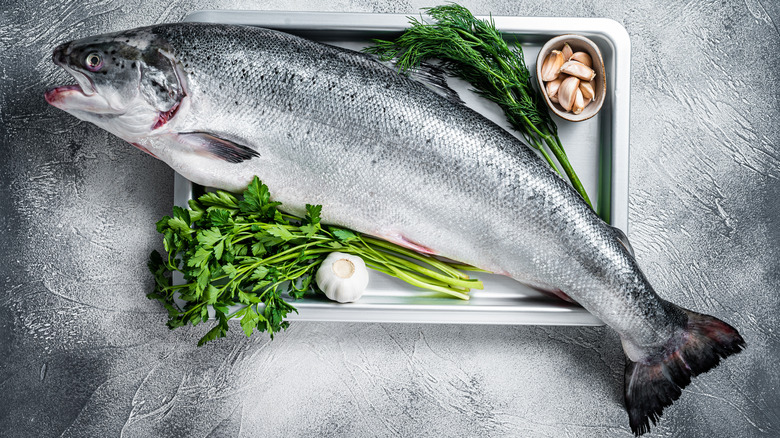 And yet, when it comes to seasoning fresh fish, we don't usually see dried herbs as the go-to choice. Other than perhaps dried cayenne, paprika, or chili pepper, most fresh fish recipes call for fresh herbs. This honey citrus salmon recipe, for example, requires minced garlic, chopped parsley, and chopped chives — all fresh. Similarly, this trout meunière calls for chopped fresh parsley instead of dried. Have you ever wondered why that is the case? Turns out, fresh herbs have unique properties that allow them to interact more harmoniously with fresh fish compared to their dried counterparts.